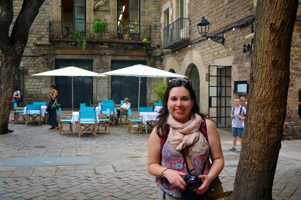 | Bárbara junto al café donde se filmó una escena de la película de Woody Allen Vicky, Cristina Barcelona. |