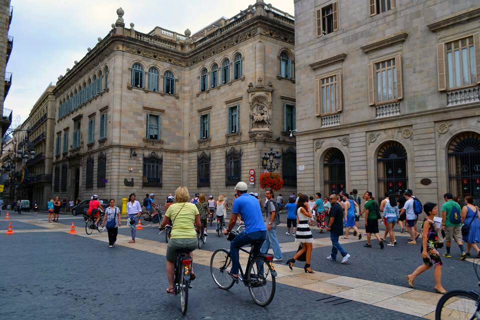 Nos bajamos del metro Jaume I en la Plaça de l’Àngelque es el punto de encuentro que salía en la página de facebook de la empresa turistica, vemos a un grupo de gente, la mayoría gringos, juntándose en torno a unas personas que tienen poleras y quitasoles rojos, señal de que serán nuestros guías en el tour caminando por Barcelona.
